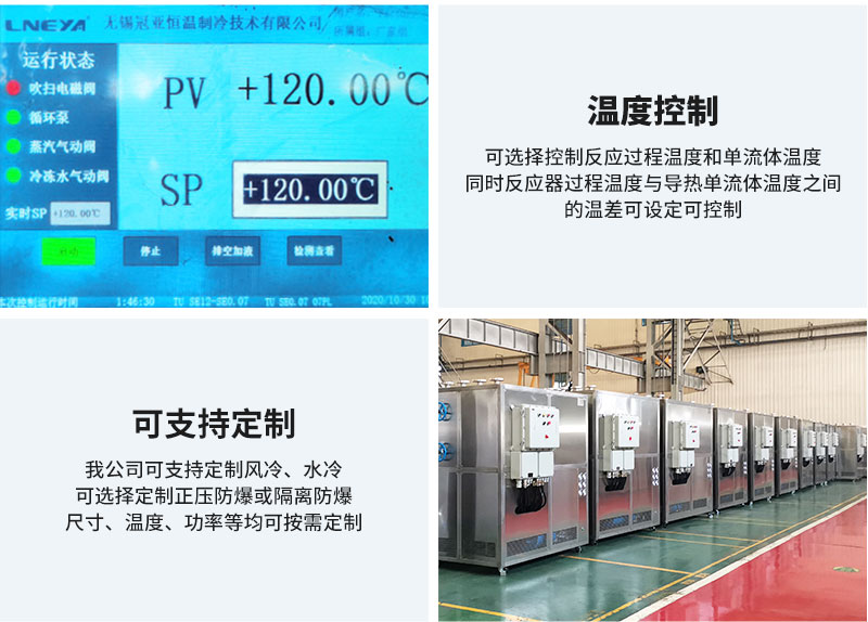 | SR-N | 一組冷卻換熱器,一組加熱換熱器,通過比例調(diào)節(jié)閥控制冷熱量進入到換熱器,再通過統(tǒng)一介質(zhì)輸入到反應釜夾套進行換熱控溫,系統(tǒng)內(nèi)置有膨脹罐 | ||||