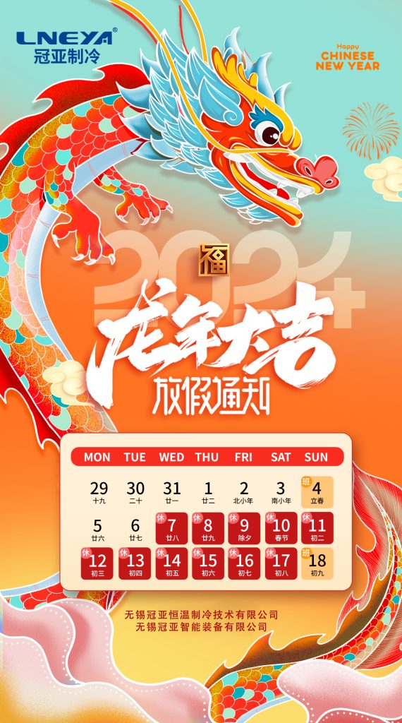 在新的一年我們會更加努力,為您提供好的產(chǎn)品與服務(wù)。結(jié)合公司實際情況,冠亞制冷春節(jié)放假時間如下: